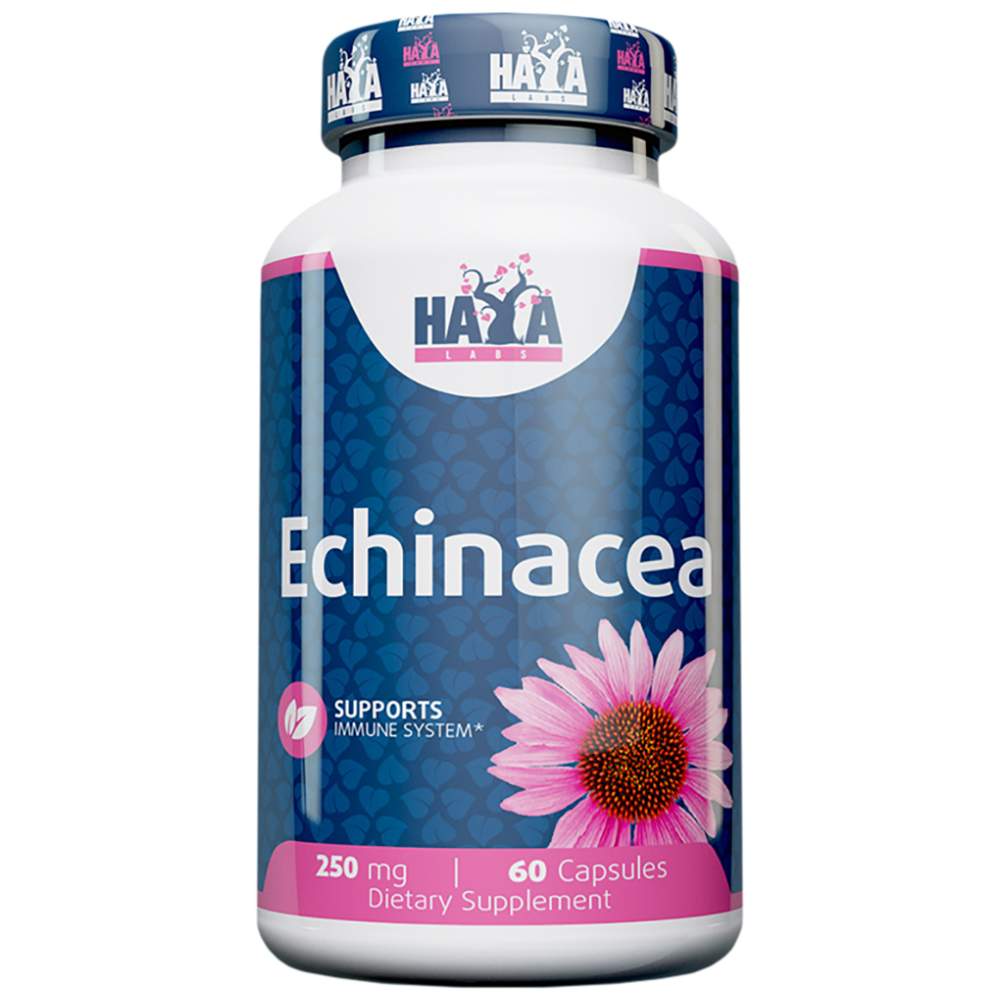 HAYA Labs Echinacea е една от най-популярните и добре проучени терапевтични билки, познати днес. Тя е свързана със семейство Сложноцветни и е най-продаваната билка в САЩ. Съществуват 9 различни вида но само три се използват за медицински цели; Echinacea angustifola, Echinacea purpurea и Echinacea pallida. Американските изследвания са фокусирани основно върху Echinacea angustifola, докато европейските върху Echinacea purpurea. Местните индианци я използват за поддържане на имунната система в продължение на стотици години. Съществува голямо количество научни доказателства, потвърждаващи факта, че Echinacea е полезна за имунната система; както и за поддържане производството на бели кръвни телца. Клинични анализи показват ползи при употребата на неин екстракт за намаляване остротата и продължителността на настинки и грип, с вероятно скъсяване на периода с 1-4 дни. В допълнение клинични изследвания показват, че Ехинацеята е ефективна в превенцията и третирането на инфекции на горните дихателни пътища. Познатите активни съставки, уникални за това растение, са например полизахариди и фитостероли. Използваните части са корен и лист.