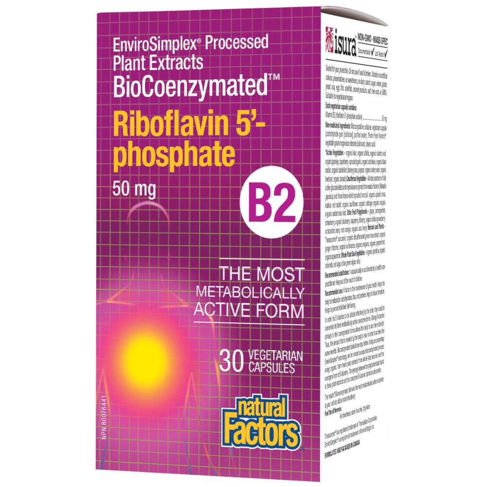 Natural Factors BioCoenzymated™ Витамин B2 с рибофлавин-5-фосфат 50 mg е висококачествена хранителна добавка, създадена да осигури на организма ви най-биоактивната форма на витамин B2. Рибофлавин-5-фосфат е коензимната форма на витамин B2, която позволява директно усвояване и използване от клетките, без необходимост от допълнителни преобразувания. Това гарантира по-бързо и ефективно действие, подпомагайки множество жизненоважни процеси в организма.