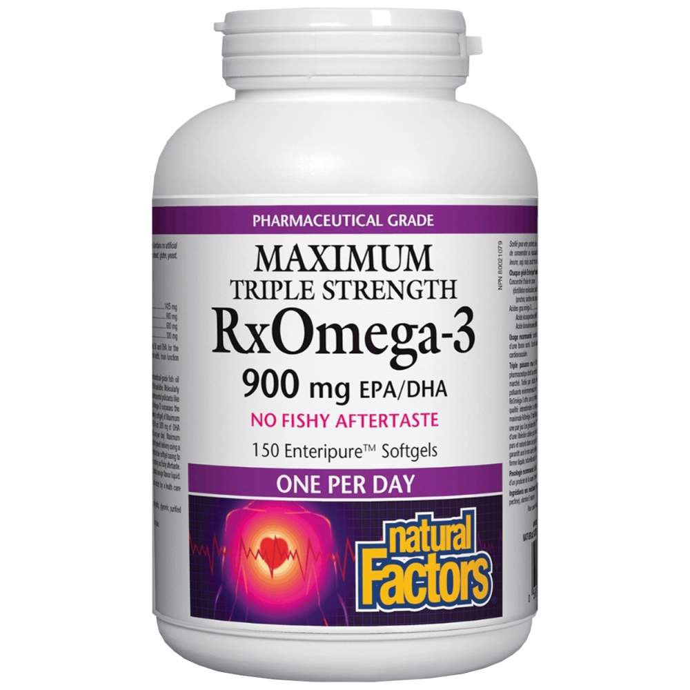 Natural Factors RxOmega-3 900 mg Maximum Triple Strength е вашият премиум източник на омега-3 мастни киселини, предназначен за тези, които търсят максимален ефект за поддръжка на здравето на сърцето, мозъка и съвместимостта на ставите. Този продукт предлага висококонцентриран рибен маслен екстракт с 900 mg на доза, от които 600 mg ЕПА (ейкозапентаенова киселина) и 300 mg ДХА (докозахексаенова киселина), в удобни Enteripure™ софтгел капсули. Технологията Enteripure гарантира, че маслото се абсорбира в тънкото черво, без да предизвиква неудобства като рибен привкус или рефлукс. RxOmega-3 е подложен на молекулно дестилиране за изключителна чистота, отстранявайки всякакви тежки метали, ПХБ или други замърсители, правейки го сигурен и ефективен избор за поддръжка на оптимално здраве.