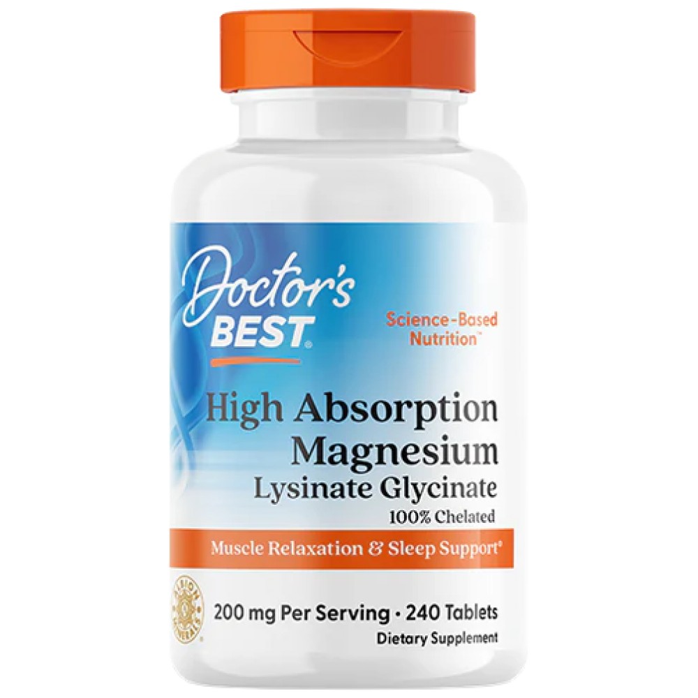 High Absorption Magnesium Chelated 120 таблетки от Doctor's best подпомага предаването на нервни импулси, правилната работа на кръвосъсирването, за производство на АТФ и за синтезирането на собствени белтъчини в организма. Стимулира отделянето на жлъчни сокове, повишава двигателната активност на червата и понижава риска от развитие на остеопороза. Употребата му повишава минералната плътност на костната тъкан.