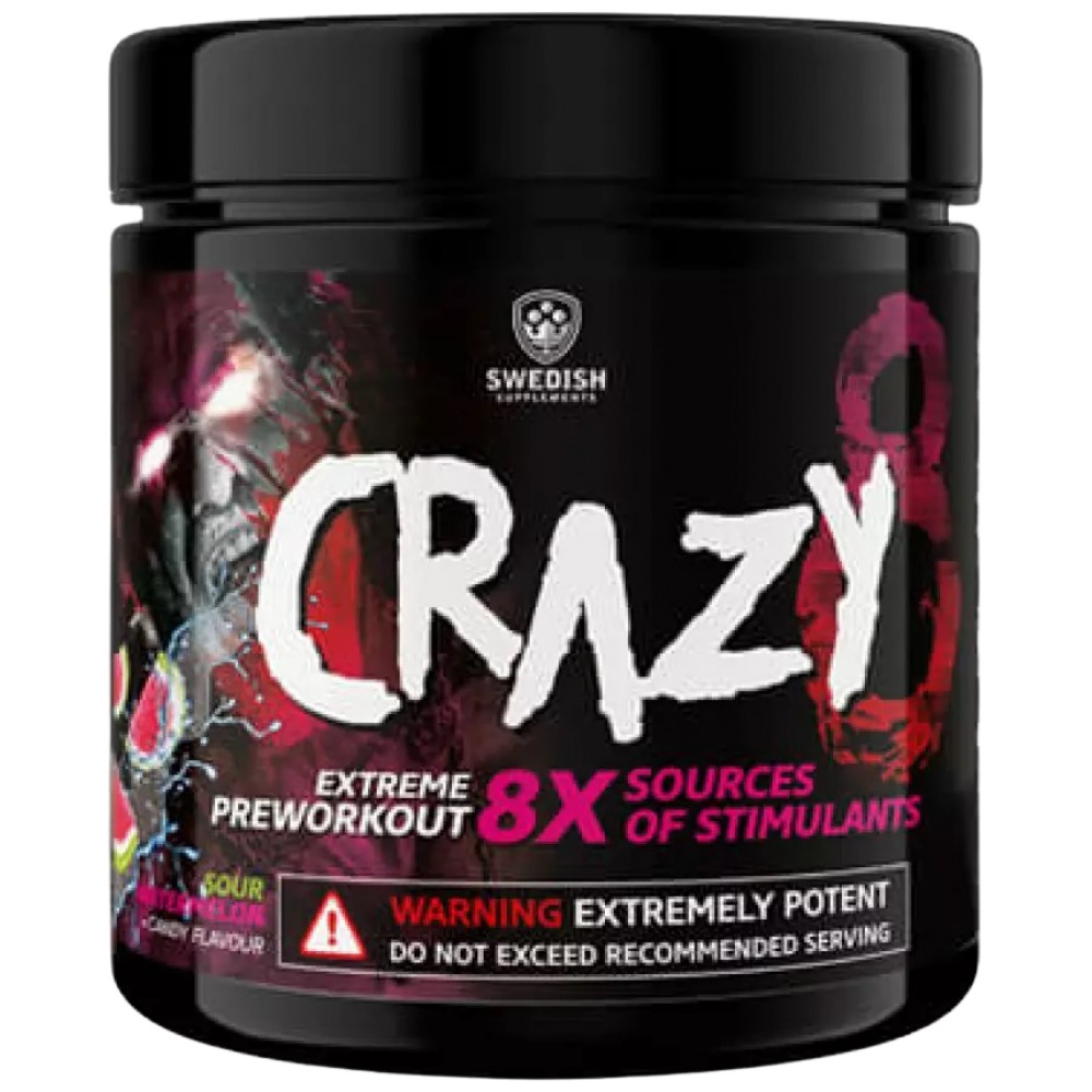 От дълго време отделът за развитие на Swedish Supplements работи по нова уникална формула за енергия, фокус и повишена производителност. Резултатът е Crazy 8. Той съдържа не по-малко от 8 различни симуланти, които работят заедно в синергия и ви държат нащрек и се усещат от първата до последната доза. Симулантната формула се състои главно от различни кофеинови източници, извлечени от растителното царство. Следователно те имат различен характер, но с подобен ефект и дават комбиниран и изкючително силен ефект.