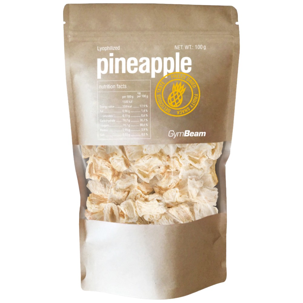 Лиофилизиран ананас - сушени чрез замразяване парченца ананас, които ще ви спечелят с уникалния си аромат, богат цвят и свеж вкус. Ананасът преминават процес на лиофилизация, т.е. дълбоко замразяване при много ниско налягане, благодарение на което запазва всичките си уникални свойства на пресен плод. Парченца пълни са с фибри, витамини, минерали, антиоксиданти и други важни хранителни вещества. Те не съдържат добавена захар и се произвеждат единствено от 100% ананас. Сушените чрез замразяване парченца ананас са идеални за приготвяне на любимите ви рецепти, но също така ще ги харесате и като здравословен хрупкав снак или като част от вашата здравословна закуска, овесена каша и йогурт. Ще им устоите ли?