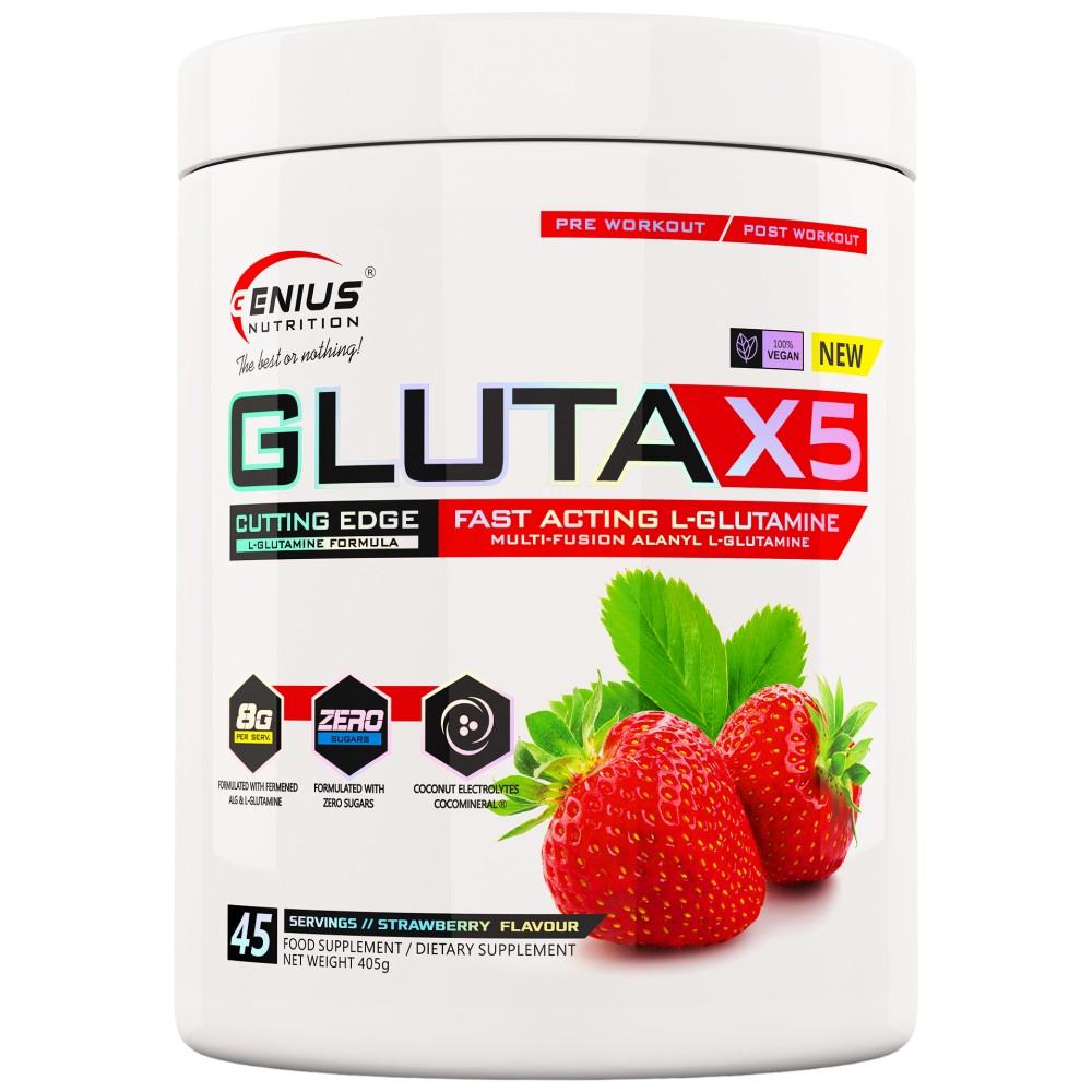 GLUTA-X5 е хранителна добавка, съдържаща L-глутамин, които е предназначен предимно за спортисти и хора, изложени на високи физически натоварвания. Всъщност, глутамина представлява 60% от всички аминокиселини в тялото. Той е важен за растежа на мускулите, но употребата му е много широка. По същество тий е надежден защитник на имунитета срещу всеки вирус, засилва секрецията на хормони и може да образува нови аминокиселини.