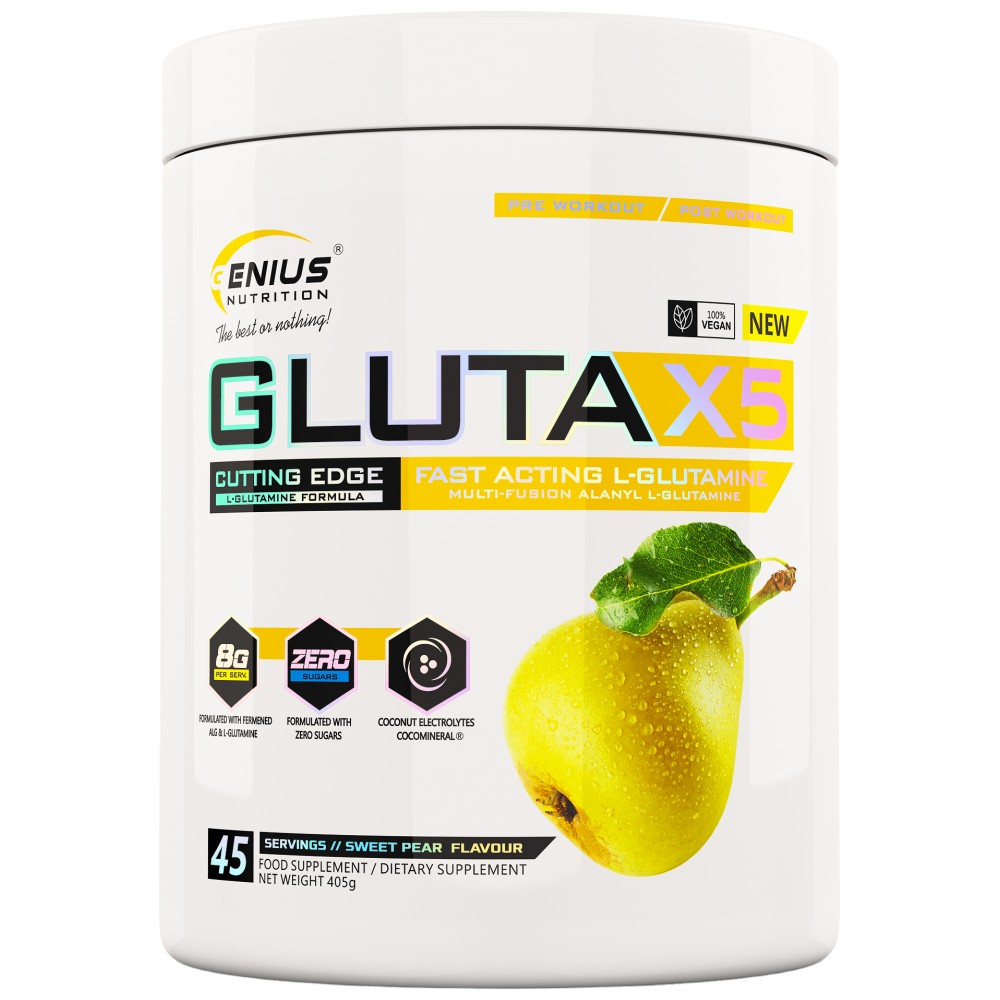 GLUTA-X5 е хранителна добавка, съдържаща L-глутамин, които е предназначен предимно за спортисти и хора, изложени на високи физически натоварвания. Всъщност, глутамина представлява 60% от всички аминокиселини в тялото. Той е важен за растежа на мускулите, но употребата му е много широка. По същество тий е надежден защитник на имунитета срещу всеки вирус, засилва секрецията на хормони и може да образува нови аминокиселини.