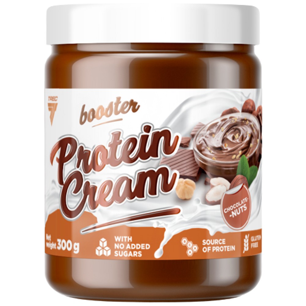 Протеинов крем с лешници и какао, без добавени захари, съдържа естествено срещащи се захари. BOOSTER PROTEIN CREAM CHOCOLATE-NUTS е вкусен крем за намазване на хляб, подсладен с малтитол. Консумацията на храни, съдържащи малтитол вместо захар, допринася за поддържането на минерализацията на зъбите. BOOSTER PROTEIN CREAM ШОКОЛАД-ЯДКИ съдържат растителни стероли. Растителните стероли допринасят за поддържането на нормални нива на холестерола в кръвта. Благоприятният ефект се постига при дневен прием на поне 0,8 g растителни стероли. Продуктът може да образува слоеве. Ако забележите мазен слой върху маслото, просто го разбъркайте отново, преди да консумирате.