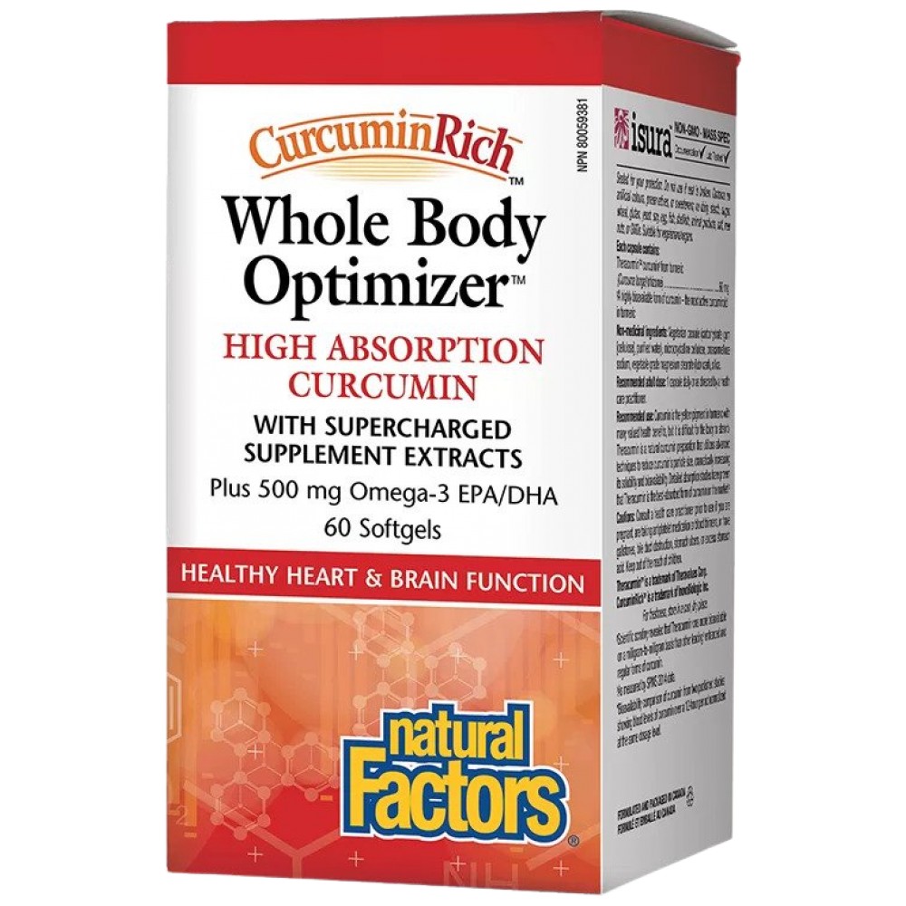 CurcuminRich Whole Body Optimizer от Natural Factors е премиум комбинация от съставки, разработена за подпомагане на здравословното функциониране на цялото тяло. Този продукт включва Theracurmin, високо абсорбиран екстракт от куркума, известен с мощните си антиоксидантни и анти-възпалителни свойства, заедно с омега-3 маслни киселини EPA и DHA от рибено масло, босвелия, антиоксидантно-богатия комплекс InflamRelief и астаксантин. Всичко това е събрано в удобни софтгели, които осигуряват лесен прием и максимална абсорбция. CurcuminRich Whole Body Optimizer е специално формулиран за хора, които търсят комплексно решение за поддръжка на сърдечно-съдова, когнитивна, имунна и мускулно-скелетна здравина, предлагайки мощна подкрепа за управлението на възпалението и за общото здравословно състояние на организма.