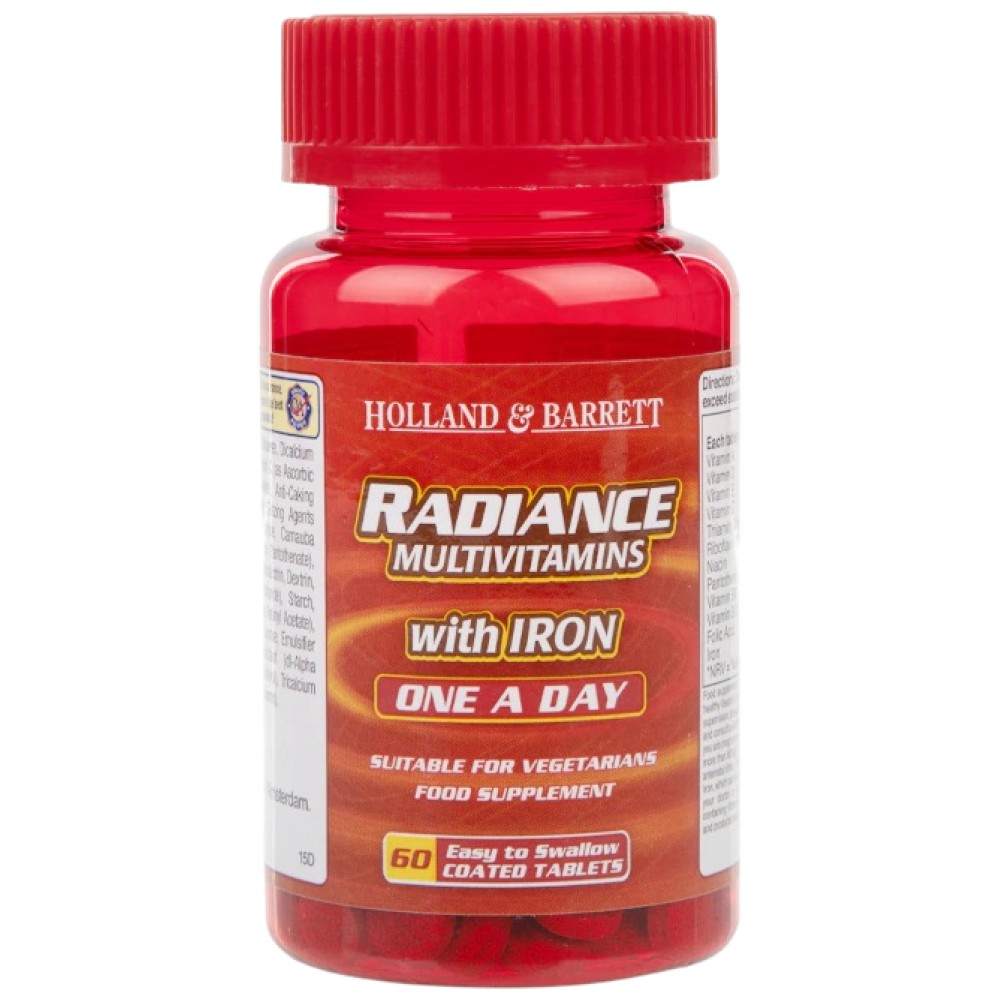 Holland & Barrett Radiance Multivitamins & Iron | One a Day съдържат мултивитамини и минерална формула, която осигурява пълноценна хранителна подкрепа за възрастни в удобна и икономична таблетка за един ден.