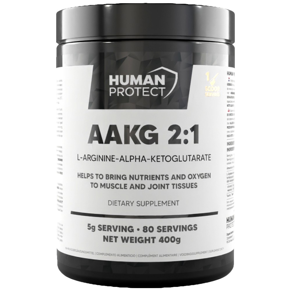 Human Protect AAKG 2:1 Powder | L-Arginine-Alpha-Ketoglutarate е аминокиселина, образувана от две молекули Аргинин, свързани с една молекула Алфа-кетоглурат. Смята се, че Arginine Alpha-Ketoglutarate е по-ефективен от обикновия Аргинин, тъй като увеличава нивата на азотен оксид за продължителен период, а не само временно. Той има свойството да подпомага покачването на качествена мускулна маса, да увеличава силата и издръжливостта.