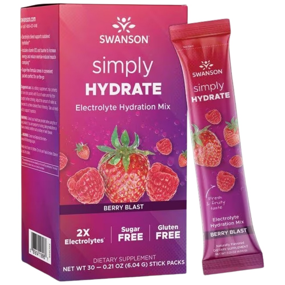 **Swanson Simply Hydrate** предоставя концентрирана формула, богата на есенциални минерали, витамини и аминокиселини, които подпомагат възстановяването на електролитите и енергийния баланс. Всяка опаковка съдържа 30 индивидуални пакетчета, които са лесни за носене и употреба навсякъде. Продуктът е без захар и се предлага в разнообразни освежаващи вкусове като лимон-лайм, горски плодове и портокал.