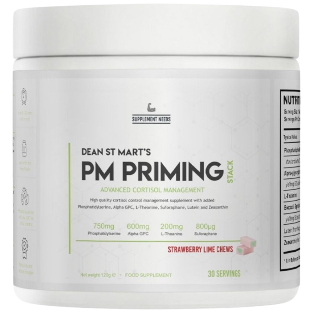 PM Priming Stack е напълно прозрачен продукт без скрити съставки, съдържащ 8 активни съставки, всички в ефективни дози, част от гама Dean St Mart Health на Supplement Needs.