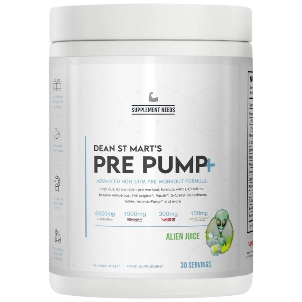 Supplement Needs Pre Pump+ е предтренировъчна добавка без стимуланти, създадена да подобри мускулните помпи, хидратацията и невротрансмитерната подкрепа по време на тренировка. Формулирана от д-р Дийн Ст Март, тя съдържа 11 активни съставки в ефективни дози.
