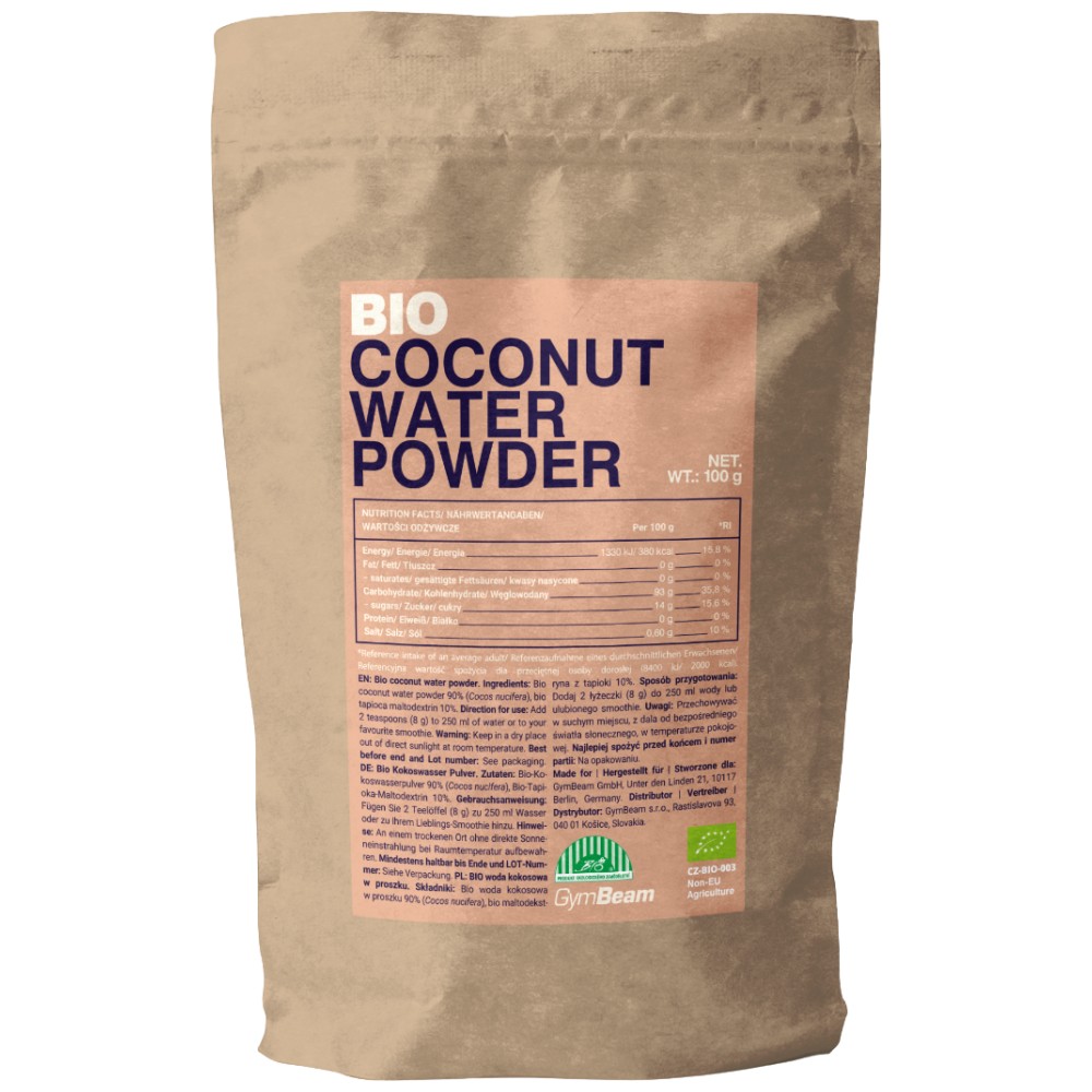 БИО Кокосовата вода на прах съдържа естествени минерали, получени от кокосови орехи с най-високо качество. Направена е от прясна кокосова вода, която се изсушава чрез пулверизиране до получаването на фин бял прах.
