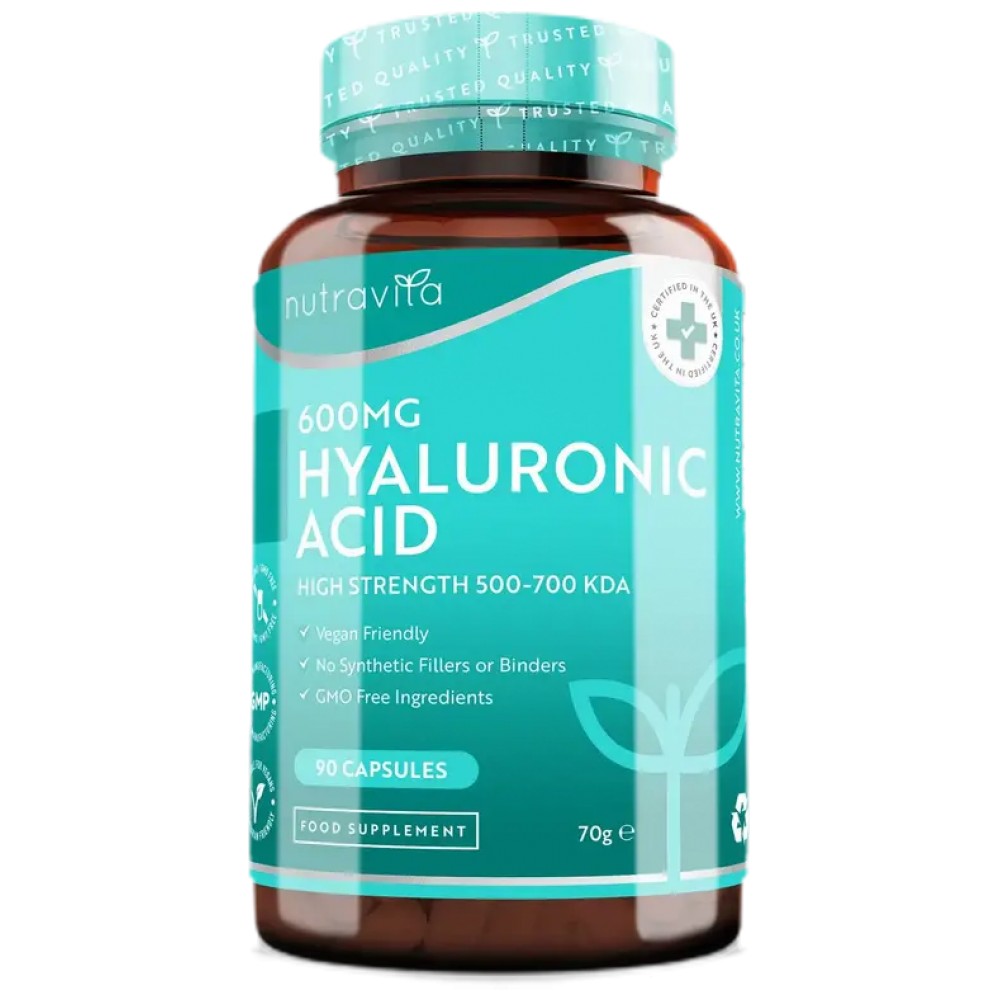 Хранителната добавка на Nutravita съдържа 90 високодозирани капсули, всяка със съдържание от 600 mg хиалуронова киселина, произведена от 100% растителни източници. Една опаковка стига за 3 месеца прием, а съотношението цена - качество, е най-доброто към момента. Тя се отличава с висока доза на хиалуронова киселина, която се предоставя в една капсула, в сравнение със стандартните добавки, които предлагат около 50-100 mg на ден. Тази висока доза гарантира максимална ефективност при приема на продукта, без докладвани странични ефекти.