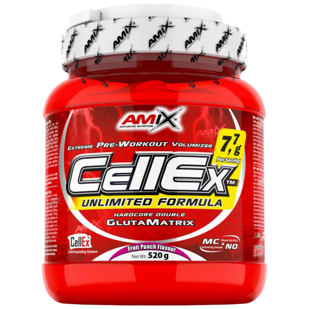 Amix CellEx Unlimited Powder е високоефективна предтренировъчна добавка, създадена да изведе вашите тренировки на ново ниво. Тази уникална формула комбинира мощни съставки, които увеличават обема на мускулните клетки, подобряват кръвообращението и снабдяването с кислород, осигурявайки максимално физическо представяне и мускулен растеж. Със своя освежаващ вкус на плодов пунш, CellEx Unlimited превръща всяка тренировка в изживяване, изпълнено с енергия и мотивация.