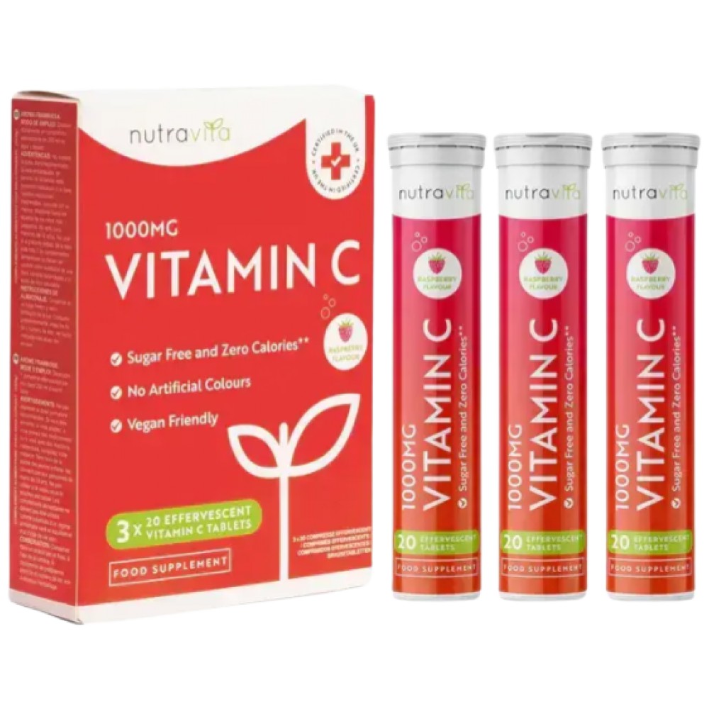 Нашите лесни за разтваряне ефервесцентни таблетки съдържат 1000 mg витамин С от аскорбинова киселина. Всяка кутия съдържа 3 опаковки с 20 ефервесцентни таблетки във всяка, което ви дава общо 60 разтворими таблетки, което е отлично съотношение цена-качество! Ние не използваме никакви изкуствени оцветители, аромати или подсладители и нашите таблетки съдържат нула калории.