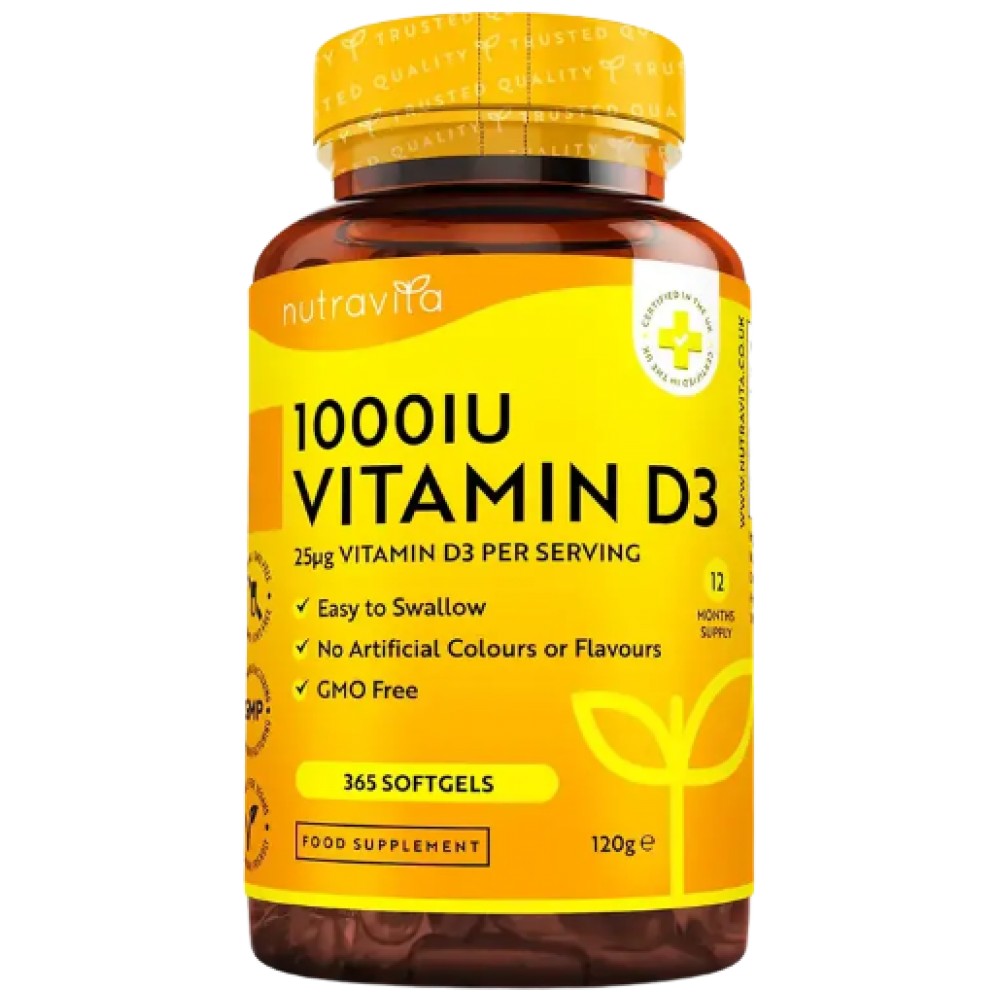 Nutravita Vitamin D3 1000iu (25µg), (The Sunshine Vitamin) осигурява предпочитаната форма на витамин D3. Витамин D3 е по-мощната форма на витамин D, тъй като е специфичната форма, произведена от човешкото тяло.
